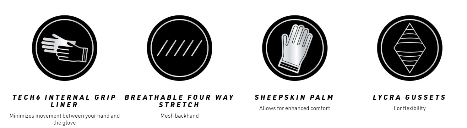 Breathable batting gloves with a four-way stretch mesh backhand, sheepskin leather palm for comfort and Tech6 internal grip liner to minimize movement between your hand and the glove.